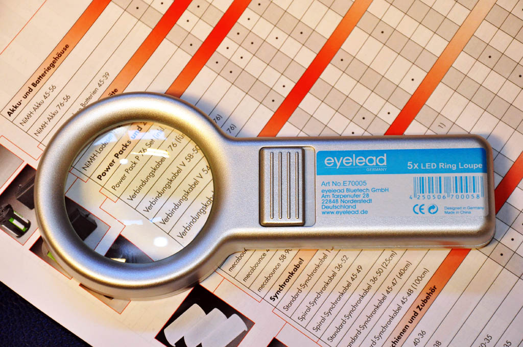 Lupen bieten vielfältige Anwendungsmöglichkeiten, sei es im Bereich der Kamerareinigung oder als Lesehilfe. Die auf der Unterseite verbauten LED`s leuchten das zu betrachtende Objekt ideal aus und ermöglichen somit eine noch bessere Betrachtungsmöglichkeit. Eyelead Ring Lupen sind in 2 Größen erhältlich: M und L. Das Modell M verfügt über 8 LED Leuchten und einen Linsendurchmesser von 55 mm, Modell L hat 10 LED`s und einen Linsendurchmesser von 76 mm. Beide Lupen werden mit 2 Mignon (AA) Batterien betrieben.